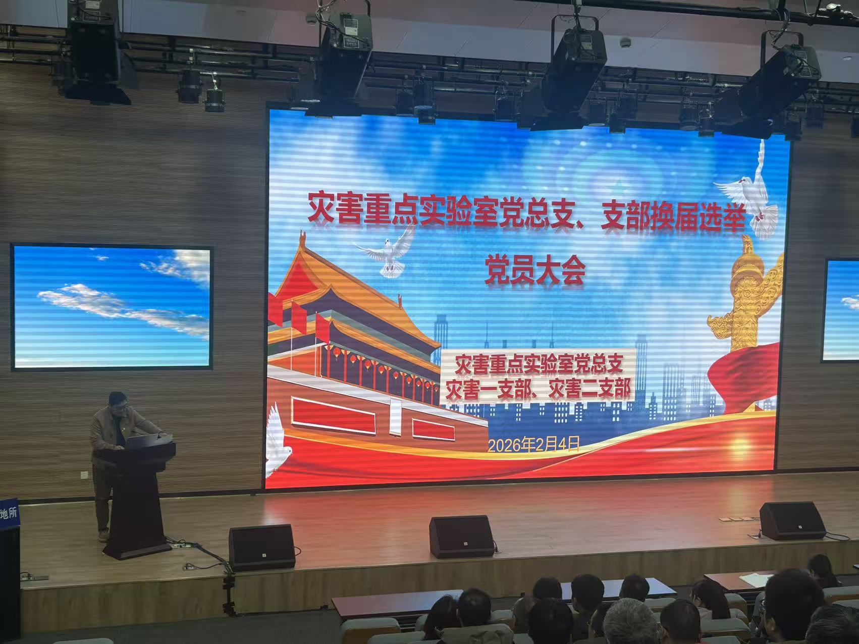2月4日下午,山地自然灾害与工程安全重点实验室党总支、灾害一支部和灾害二支部联合召开2026年第一季度党员大会,开展支部(总支)换届选举工作。重点实验室党总支68名党员出席会议,佩戴党徽,亮明身份?;嵋橛稍趾ψ苤榧茄钭谫ブ鞒?。