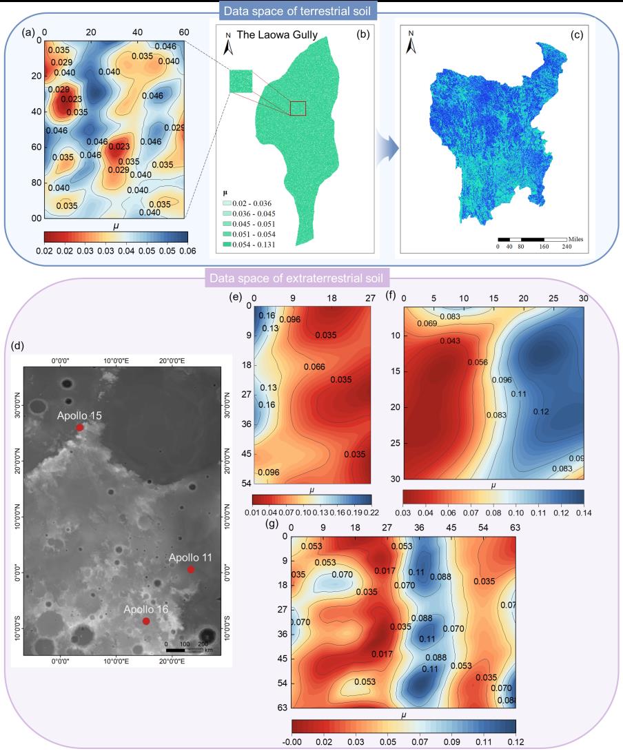 ????课题组将不同物理化学环境下的成土过程概化为分形破碎、随机碰撞和聚合,实现了地球土壤、月壤、火星土壤的颗粒分布的随机过程模拟。研究确立了统一的颗粒土壤粒径分布(GSD)函数P(D) = g(μ)D-μexp(-D/Dc),将土体颗粒特征约化为参数(μ,Dc),从而将土体可化为参数的随机颗粒场,为实现土壤参数从样本尺度向区域尺度的提升提供了理论工具。研究结果自然引出一种新的土壤研究的GSD范式,即用随时空逐点变化的GSD参数替代(或补充)传统土壤-景观范式的平均化区域性参数,将为局域地表(月表)过程和区域性演化的动力学提供新的数据基础。GSD的统一性还为月壤模拟样本实验和行星原位资源利用(ISRU)提供了新的思路。