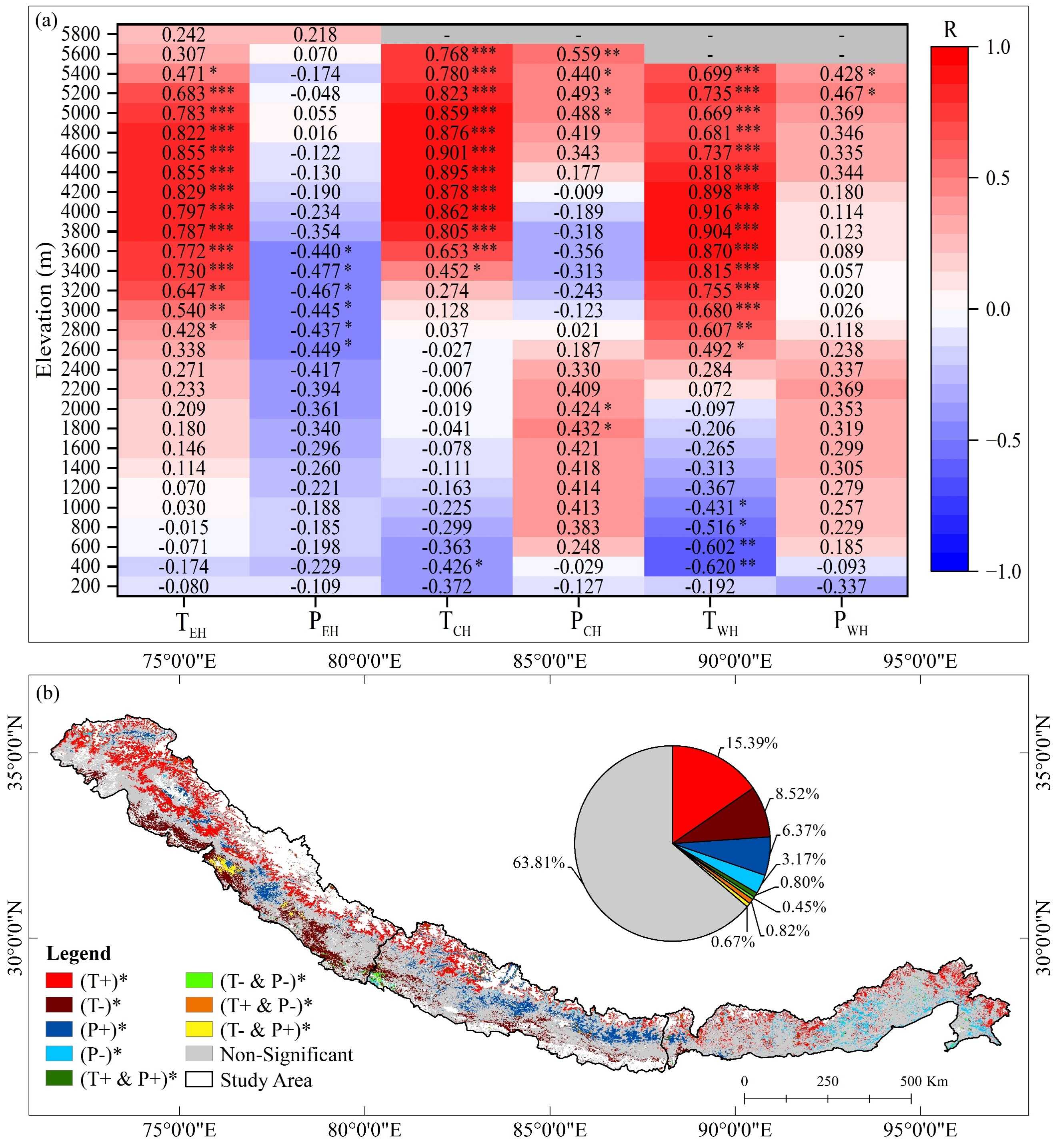 ????为解决这一问题,成都山地所赵伟研究员团队以喜马拉雅山南坡为典型研究区域,采用多维建??蚣苌钊敕治隽撕0伪浠灾脖宦潭饶J郊捌涠云虮浠煊Φ挠跋?。通过分析植被绿度在海拔梯度上的相对变化率,明确了2600米至5000米之间植被绿度的动态变化,并揭示了植被绿化随海拔增加而增强的普遍趋势。研究表明,在较高海拔区域,绿化速率显著增加,但在更高海拔时出现下降。这一海拔特异性的绿化趋势为理解喜马拉雅山地区植被对气候变化的响应提供了新的视角。此外,团队通过偏相关分析进一步探讨了植被绿度与气候驱动因子之间的海拔依赖性关系,识别了气温和降水对植被绿度影响的九个不同类别,突出了气温和降水如何在不同区域交互作用,促进或抑制植被生长。研究发现,温度在高海拔地区显著促进植被生长,而在中西喜马拉雅低地则受热应力的制约,限制了植被生长;降水则在中等海拔地区促进植被生长,但在东喜马拉雅地区,由于水涝应力的影响,绿化受限。通过将这些响应分类为九个类别,研究为理解气候变化对南坡及类似山区生态系统植被的影响提供了新的框架。
