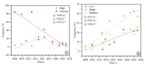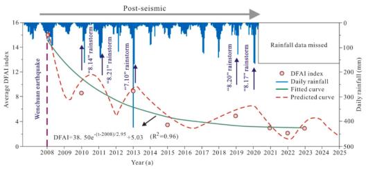 ????针对该问题,成都山地所熊江助理研究员、陈华勇研究员联合成都理工大学唐川教授及合作者们综合考虑了水文气象、地形地貌、物源发育对汶川地震震中区长期输沙效应与泥石流活动性演变互?;瓶沽顺て诠鄄庥敕治?。研究表明,震初5年,岸坡及沟道内固体物质结构松散、粘聚力较低,极端暴雨极易导致固体物质起动补给泥石流,导致该时期大部分山区流域具有极高和高泥石流活动性。然而,随着松散堆积体压实固结及表面粗化过程加剧,泥沙供给能力显著降低,泥石流活动性逐渐由极高和高分别以?0.06 yr?1 和 ?0.02 yr?1的速率向中等、低和极低活动性演变。震后受泥沙供给量逐渐减少,泥石流活动性整体以幂律规律衰减,且将持续近50年后才能恢复至震前水平。目前,汶川地震震中区约59.32%的流域泥石流活动性已经恢复至低水平,但仍有近10%流域具有极高和高泥石流活动性,且主要集中在草坡以北区域。本研究不仅提出了强震扰动区泥石流活动性时空演变监方法,更为理解同类型强震扰动区泥石流活动性长期动态演变规律提供了理论参考。