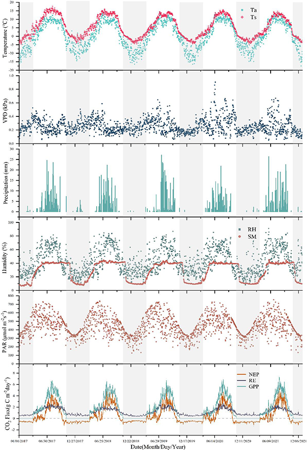 ????2017到2021年连续5年的观测数据表明,高寒湿地是重要碳汇。然而,在碳汇吸收峰值期,饱和水汽压差抑制作用也最显著。尤其是在中午时段,饱和水汽压差调节了总初级生产力对温度的响应,削弱了温度对光合作用的正向作用。进一步分析表明,即便土壤水分不受限制,高饱和水汽压差也可通过诱导植物气孔关闭抑制碳吸收。该研究强调了饱和水汽压差在碳–水耦合过程中的影响,表明全球变暖背景下饱和水汽压差增强可能成为限制高寒湿地碳汇功能的关键因子之一。