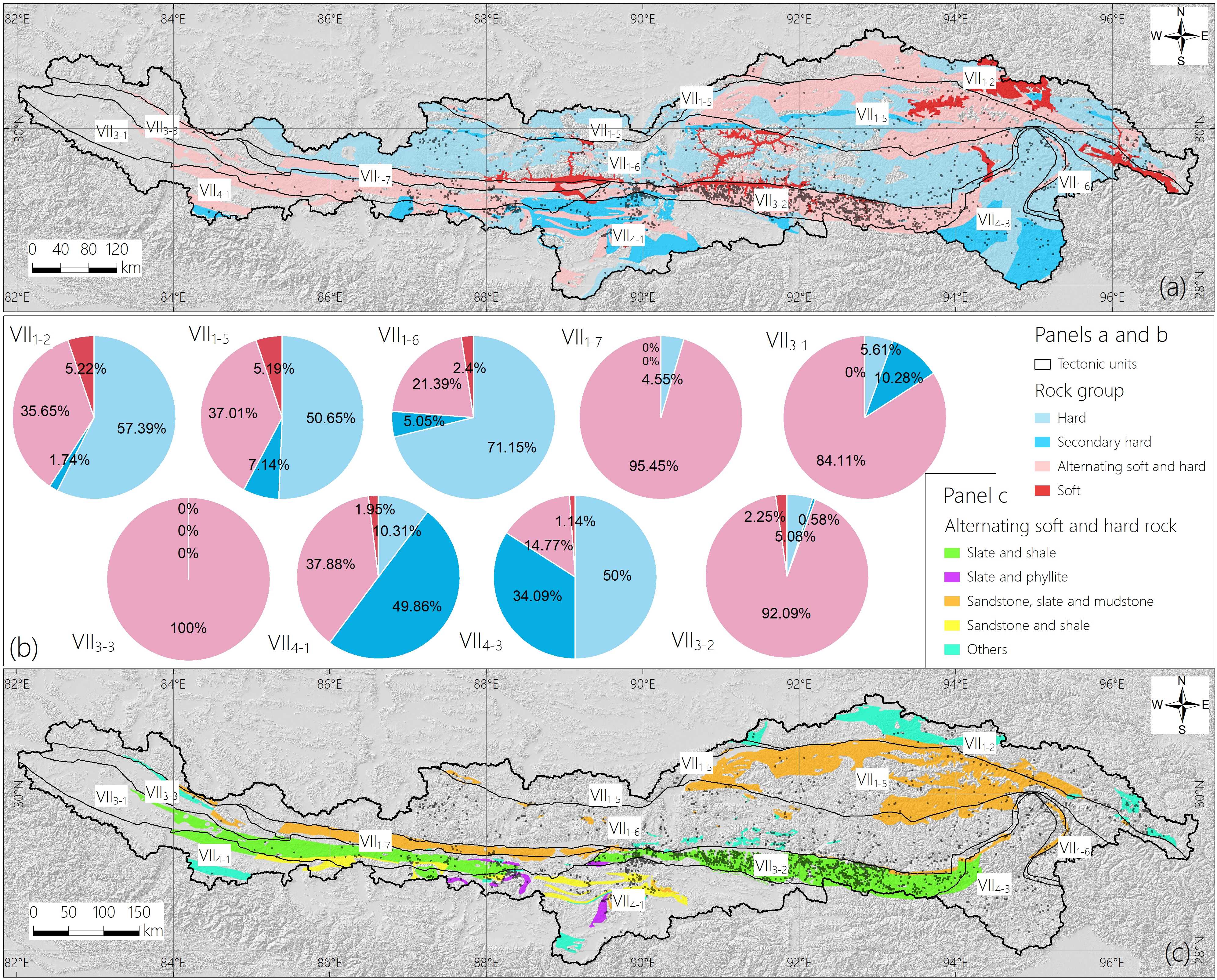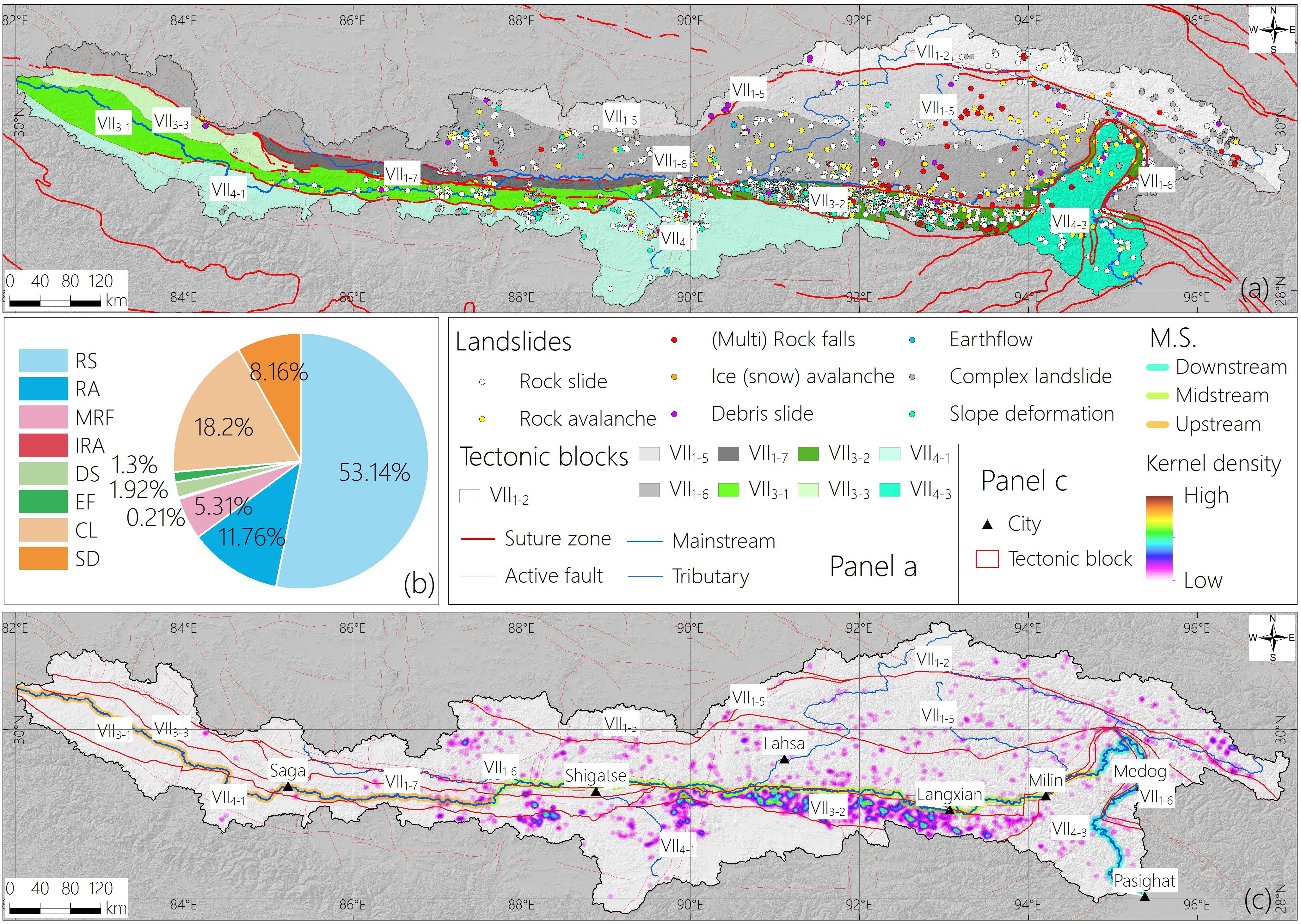 ????雅鲁藏布江位于印度板块和欧亚板块碰撞带,是全球地质构造和地形地貌最为复杂的地区之一,同时,强烈的隆升和剥蚀作用使得雅鲁藏布江流域成为地表起伏最为剧烈的区域之一,岩体破碎、地震频发,这些使得雅鲁藏布江流域成为滑坡的易发区、高发区,但该流域长期以来缺乏系统的滑坡研究。因此,分析该流域大型滑坡空间分异格局特征及驱动控制要素,可以为该流域滑坡和地貌演化研究提供科学依据。为此,成都山地所苏立君研究员团队,通过系统遥感解译与野外调查分析,对该科学问题展开研究。