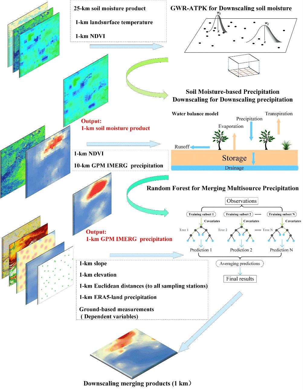 ????针对这一关键问题,成都山地所赵伟研究员团队联合中山大学研究团队提出了一种基于高空间分辨率土壤水分的降水空间降尺度与多源数据融合模型(SMPD-MERG)相结合的混合降尺度框架,有效提升了卫星降水产品的精度与应用价值。该方法充分融合GPM-IMERG卫星日降水产品、生成的ESA CCI 1 km土壤水分数据、ERA5-Land再分析降水数据以及地面测站观测数据,利用土壤水分平衡方程将原始GPM降水数据空间分辨率提升至1 km,并通过随机森林算法对多源数据进行集成,最终构建出高时空分辨率、精度优异的日尺度降水产品。