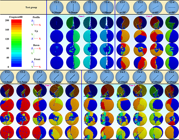 ????研究结果表明,滚石内部的预存节理几何特征在很大程度上决定了其冲击破碎的模式与能量耗散过程:当节理长度超过临界值(约为滚石直径的40%)时,滚石更容易沿节理断裂。节理倾角为45°时破碎最为剧烈,主碎块数量最多,体积破碎率最高。当节理厚度接近模型中最大颗粒半径时,裂纹更易沿节理贯通,形成大尺度破碎。而节理位置若位于滚石中间偏边缘区域,能显著提升整体破碎效果,使碎块尺寸分布更均匀。此外,节理的存在降低了滚石的冲击峰值力,加快了裂纹扩展和破裂过程,最终导致滚石反弹动能大幅下降,仅为初始动能的25%左右。这些结果清晰揭示了节理对滚石破裂行为的主导机制。