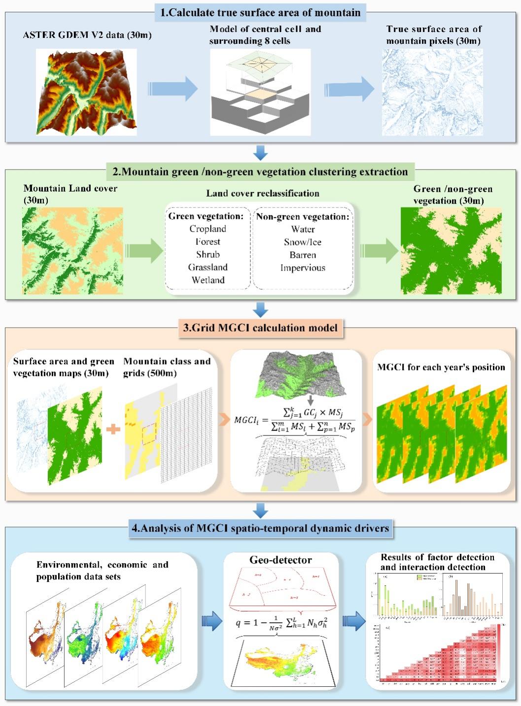 ????团队进一步创新性地构建了首个兼顾山地真实三维曲面特性的SDG15.4.2指标山地绿色覆盖指数(MGCI)估算模型。该模型改变了以往基于平面投影面积计算山地指标的局限,显著提升了评估的准确性。基于此模型,团队综合利用多源卫星遥感产品与地球大数据技术,成功实现了我国20002022年共23年间MGCI的长时间序列、高空间分辨率动态监测。监测结果显示,我国MGCI整体呈现稳定向好趋势,从2000年的78.15%提升至2022年的82.23%,年均增长率为0.18%。团队还深入分析了其时空格局演变规律与驱动机制。研究发现,该指标的改善区与极少量的退化区在空间上呈现异质性分布,且其变化与海拔、水热梯度密切相关。这一数据为联合国2030年议程的中期评估提供了重要的中国案例与数据支撑。