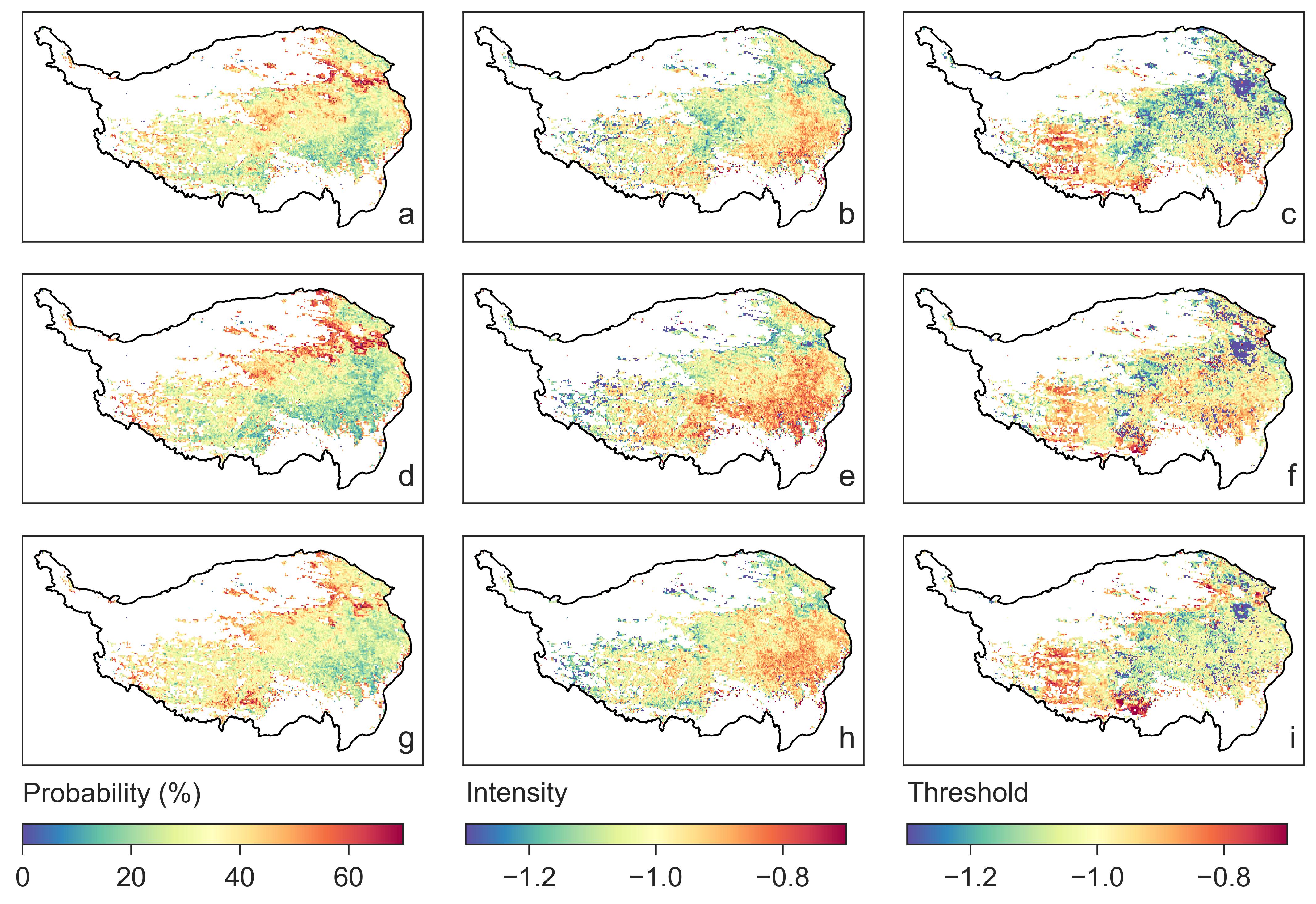 青藏高原草地在前期(a–c)、中期(d–f)和后期(g–i)三个阶段中净初级生产力受干旱影响趋势的空间分布