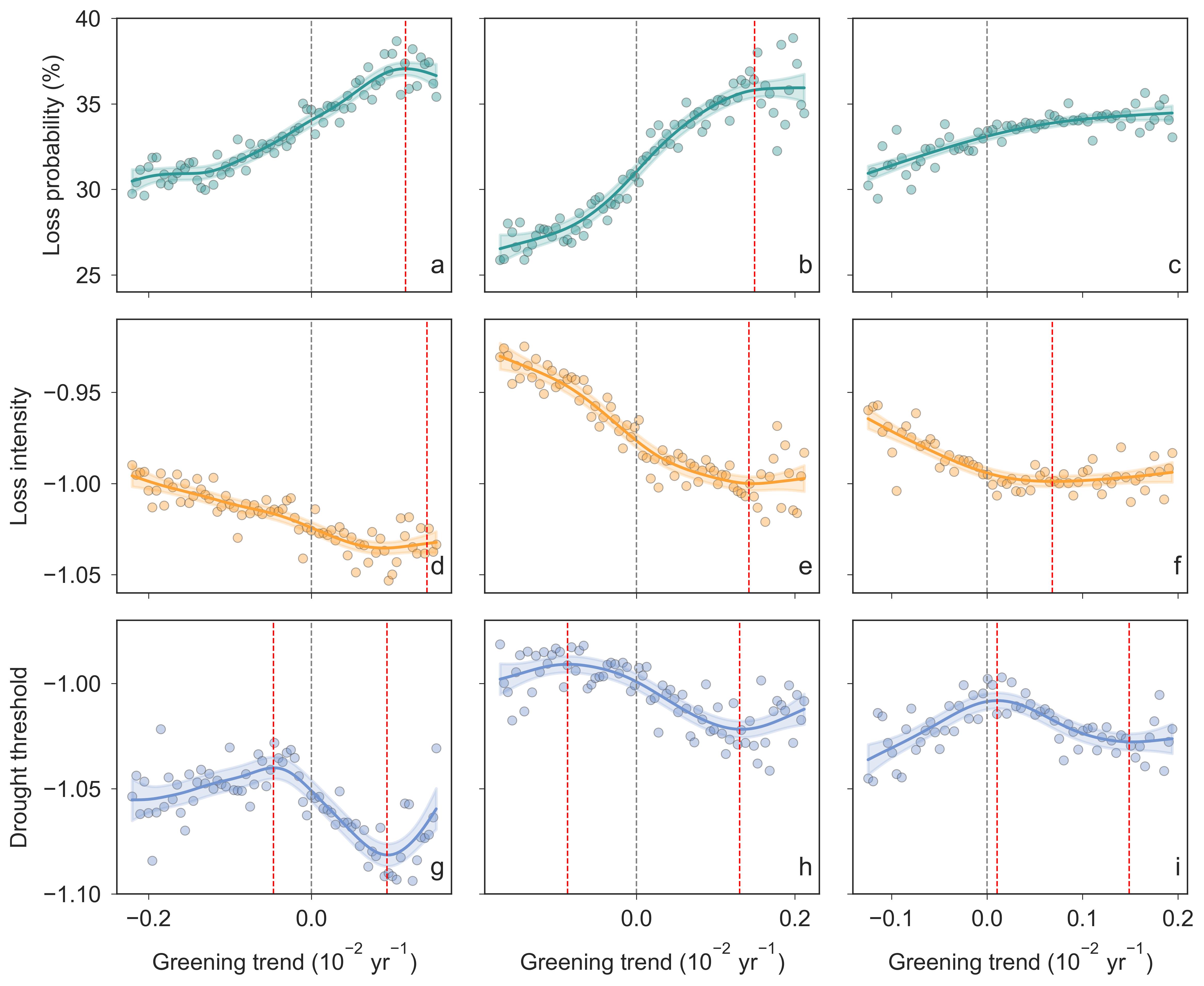 青藏高原草地在前期(a, d, g)、中期(b, e, h)和后期(c, f, i)三个阶段中绿化程度与干旱损失概率(a-c)、平均损失强度(d-f)和干旱影响阈值(g-i)的关系