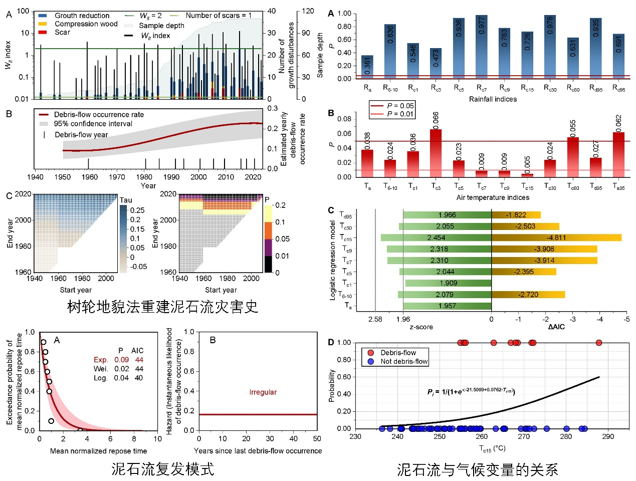 ????团队以雅江下游典型冰川沟(雪卡沟)为对象,综合树轮地貌学、多源遥感、高精度地形测量及气象统计等方法,采集并分析了110棵泥石流扰动木和32棵标准木的年轮,识别出1940年至今的11次泥石流事件,重建了冰水泥石流活动史。进一步分析发现:泥石流规模虽呈减小趋势,但发生频率从1950年代的每年0.09次显著上升至当前的0.23次。其高频活动在下游沟道和堆积扇造成持续侵蚀与沉积;该沟泥石流属于径流触发型,6-10月最大15日累积正积温与其形成存在强关联性;泥石流复发的间隔时间表现为随机模式,表明其发生主要取决于触发条件而非先前泥石流事件,这与充足的物源供给密切相关。