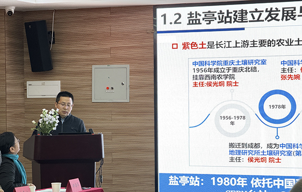 ????盐亭站站长周明华研究员从平台条件改善、任务争取、成果与人才培养、示范与社会服务等方面汇报了盐亭站近年主要工作进展。朱波研究员围绕“紫色土氮转化特性与调控机制”作了专题报告。