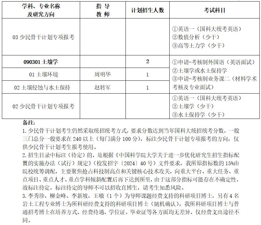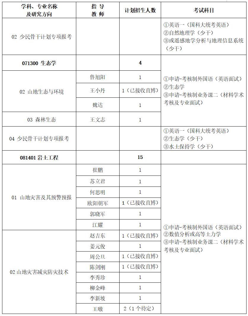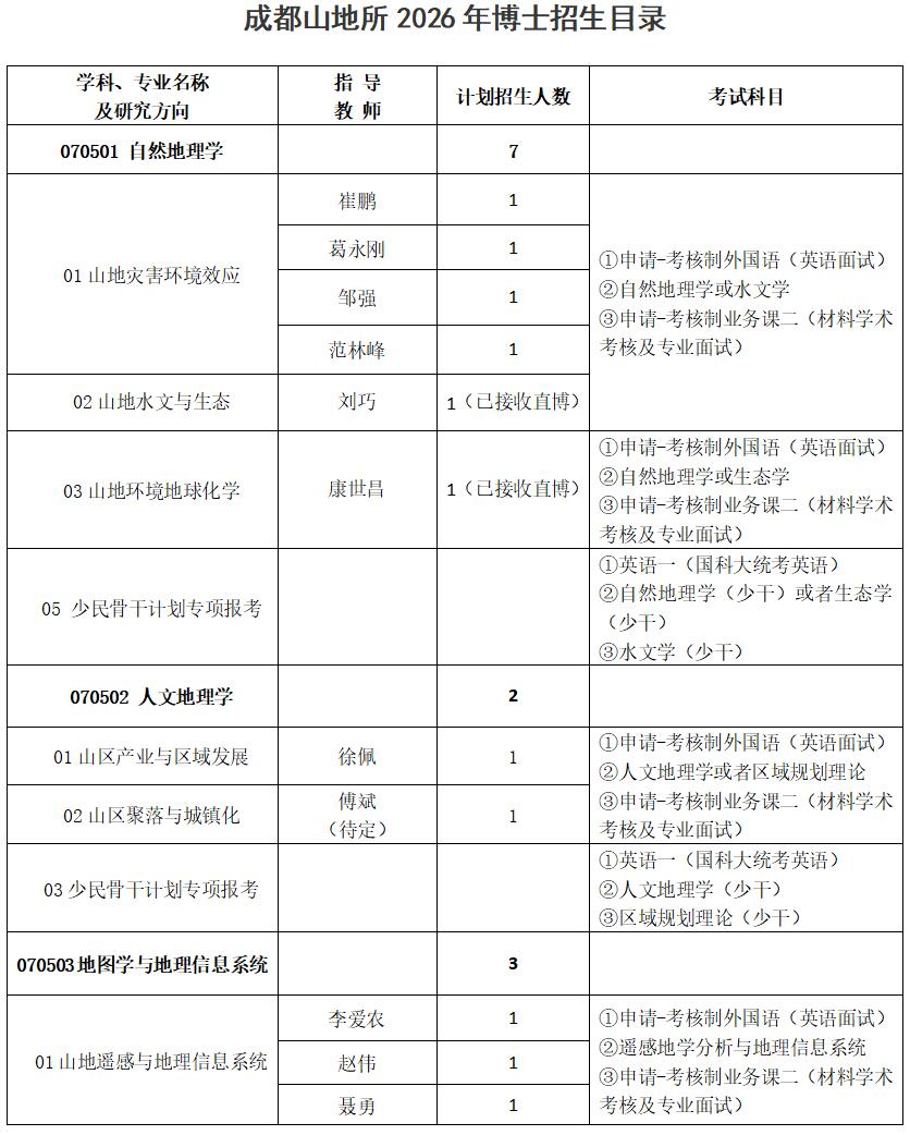 特别说明:我所招生简章招生人数目前是按照招生的总人数公布(国科大公布的招生目录信息是按照预计招收直博生和预计接收统招生分开公布),直博生占当年博士招生计划数,直博生接收实际情况以我所公示的《2026年度中国科学院、水利部成都山地灾害与环境研究所推荐免试硕士研究生(直博生)拟录取公示为准,本简章也将明确标明指标情况,请考生关注。