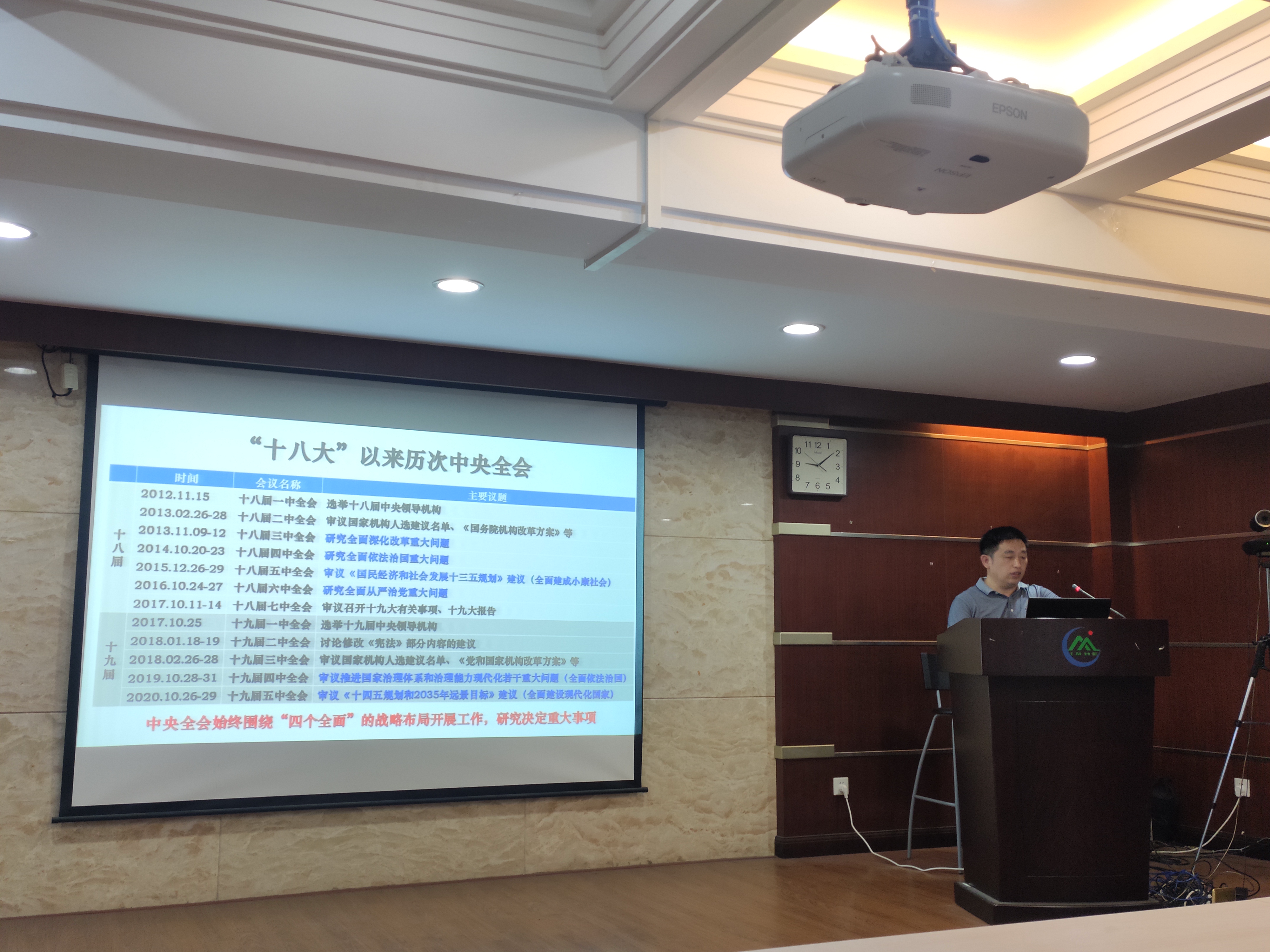 党委副书记、纪委书记谭多财以《中国特色社会主义进入新时代》为主题,从使命目标、治国方略、和所处环境三个维度对社会主义发展史进行了介绍,深刻阐述了增强“四个意识”、坚定“四个自信”、做到“两个维护”的意义。党员高嘉宁以《改革开放大事纪》为主题,带领全体党员回顾了改革开放以来的重要历史事件。党员郑晓岚传达了两院院士大会、中国科协第十次全国代表大会会议精神。