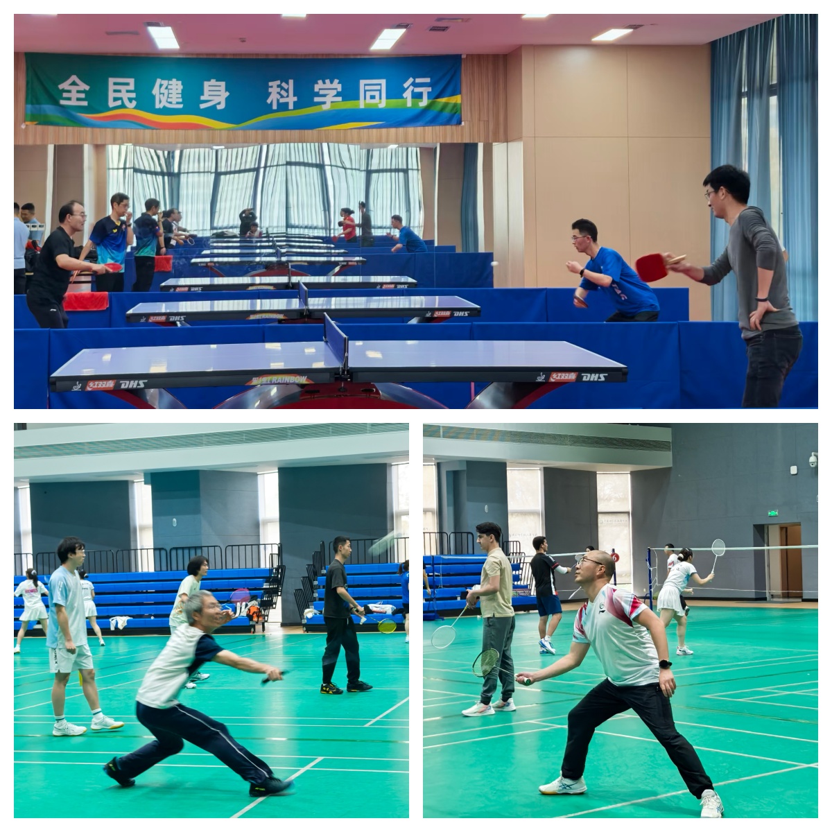 本次比赛项目涵盖羽毛球团体赛(女子双打、男子双打、混合双打)和个人赛(男子单打、女子单打)以及乒乓球个人赛(男子单打、女子单打),最大亮点是师生同赛。赛场上老师与学生们并肩作战,默契配合,通过球技的切磋,促进了彼此间的交流。在一楼羽毛球赛场上,大家斗志昂扬,高远球、劈杀、网前扑球轮番上演,展现出了精湛球技。在二楼乒乓球台,正手暴冲、反手拧拉,小球疾如流星,让人目不暇接,掌声、喝彩声此起彼伏。