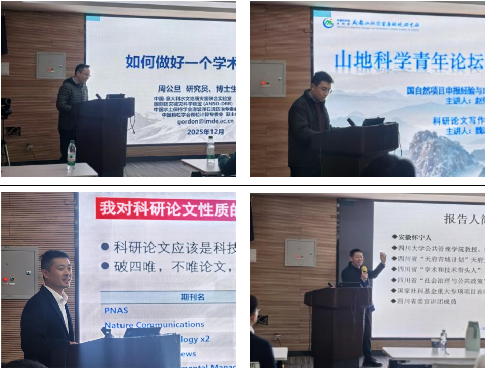 ????12月11日至15日,成都山地所举行山地科学青年论坛“青年成长”系列讲座,以“青年成长与科研、管理能力提升”为主线,特邀4位不同领域的中青年专家学者,围绕学术报告技巧、项目申报与成长路径、科研论文写作、领导力与执行力提升等4个主题开讲。党委书记、副所长谭多财出席。