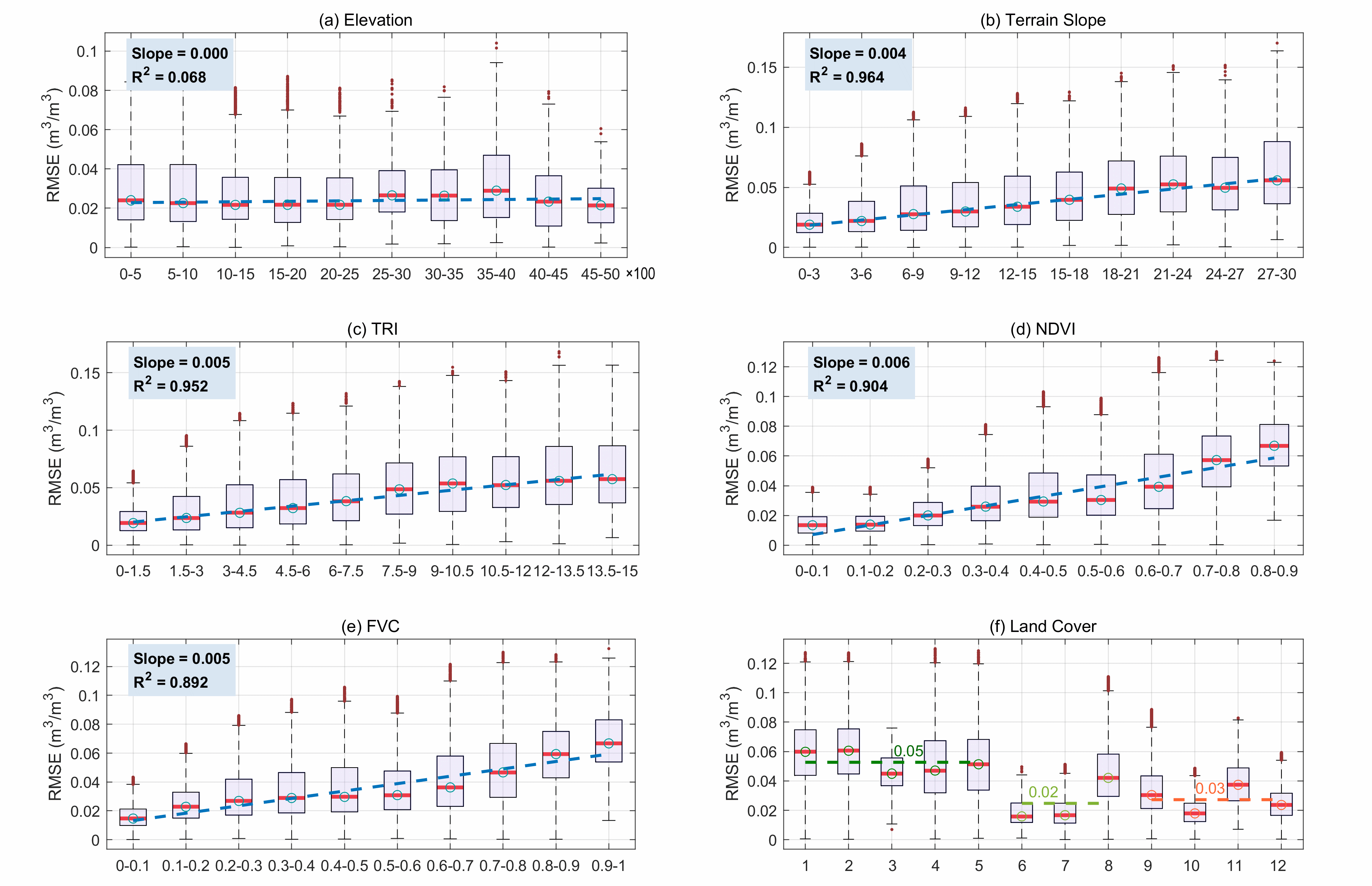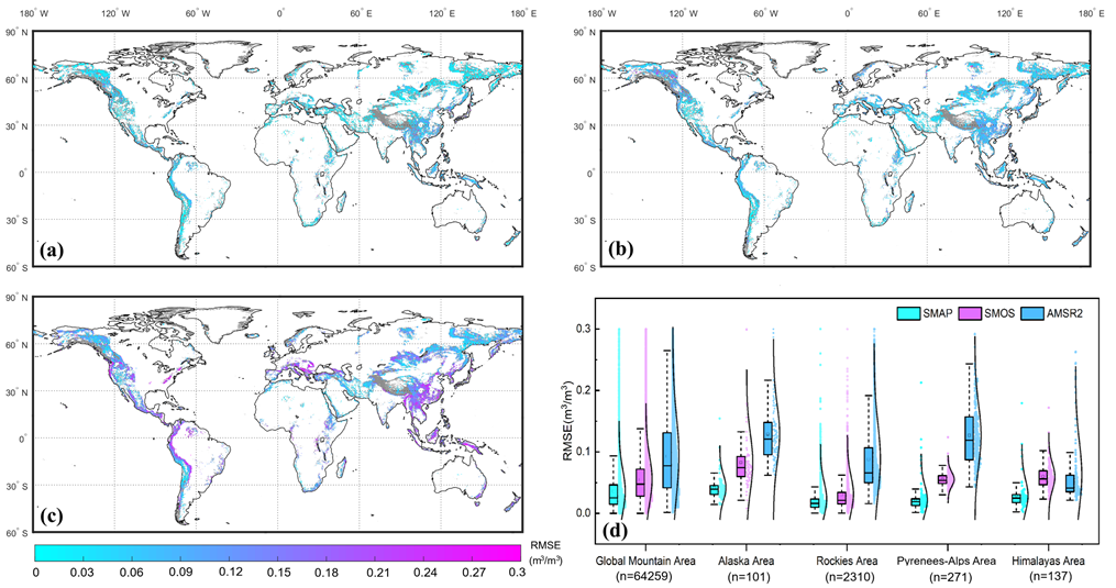 全球山区SMAP土壤水分产品的误差分布梯度(RMSE)