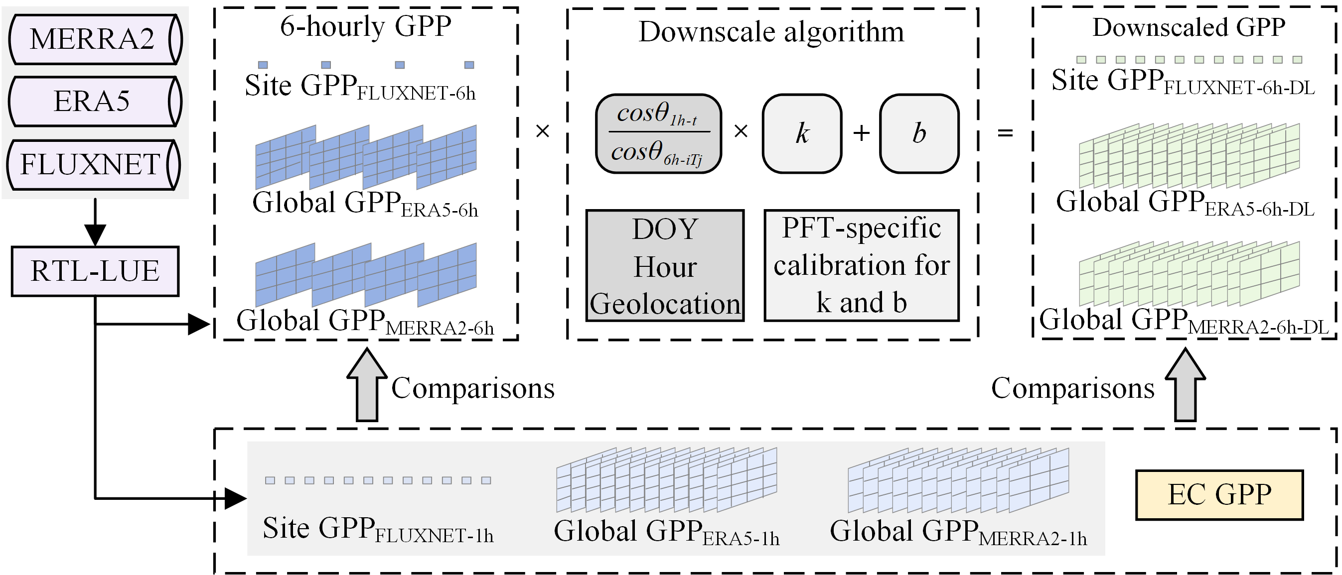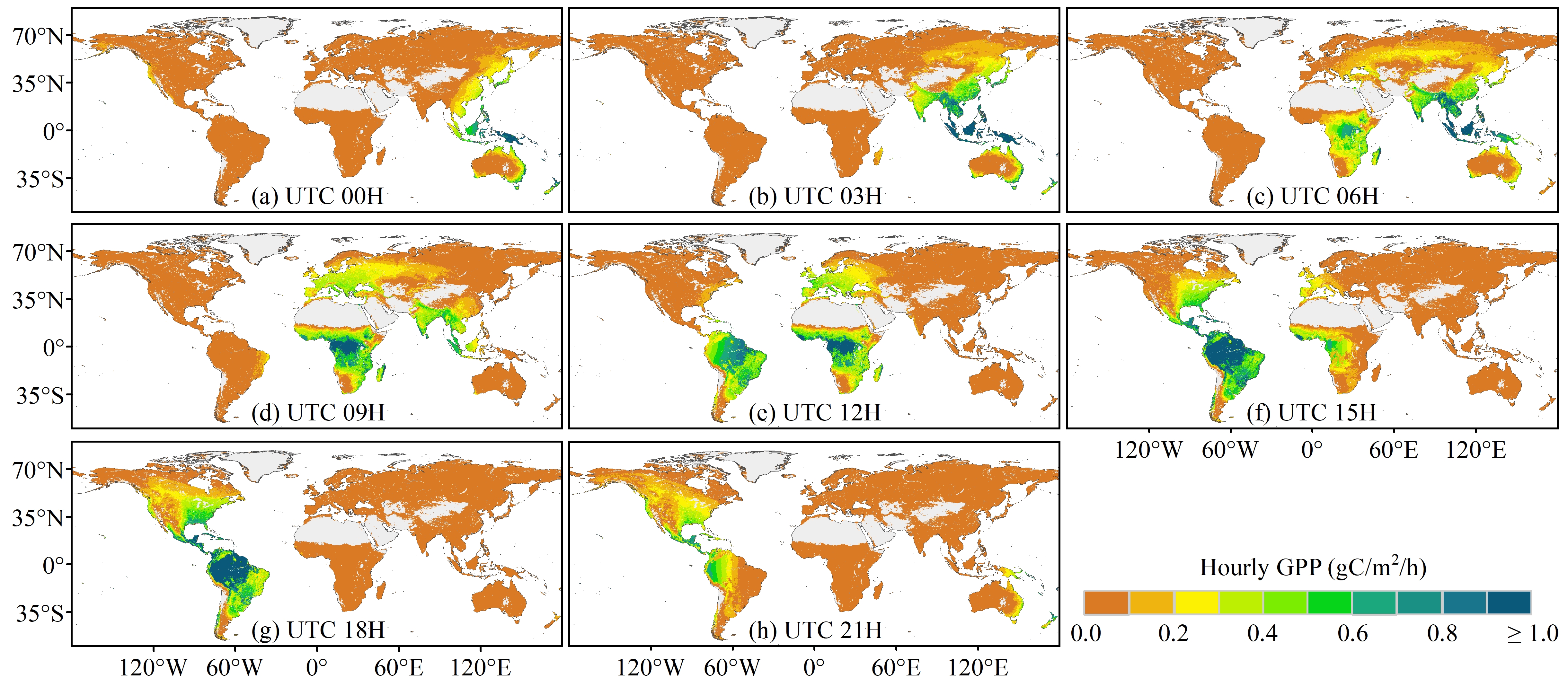 ????植被总初级生产力(GPP)是生态系统碳循环的关键参量,其精确估算对理解全球气候变化与陆地生态系统的相互作用至关重要。当前,全球GPP研究多聚焦于提升空间分辨率,但现有主流GPP产品的时间分辨率通?!?天,难以捕捉日间乃至小时尺度的生产力动态变化,限制了对生态系统快速响应环境胁迫机制的深入认识。为此,成都山地灾害与环境研究所山地地表过程智能监测与模拟团队应用RTL-LUE模型,融合多源遥感与再分析数据,成功研制并发布了全球长时序小时尺度植被GPP数据集。